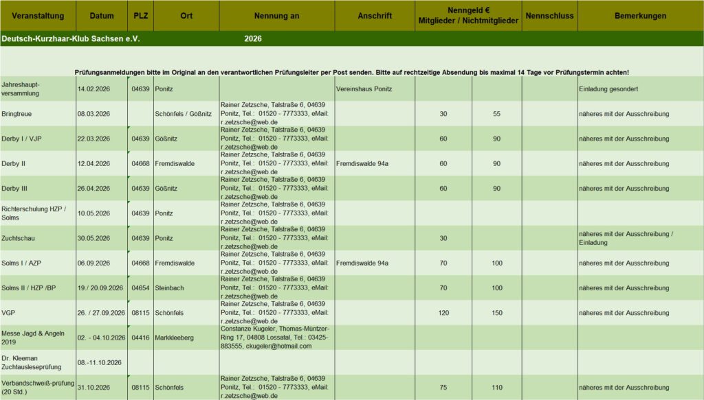 Satzung Deutsch-Kurzhaar-Klub-Sachsen eV e.V Nennformulare:Achten Sie bitte immer auf die fristgerechte Anmeldung zur Prüfung. Nennformular DK (Derby, Solms, AZP, IKP, Kleemann) Prüfungsordnungen:Die Prüfungsordnungen zu den einzelnen Prüfungen finden Sie auf der Verbandsseite Deutsch-Kurzhaar-Verband e.V |